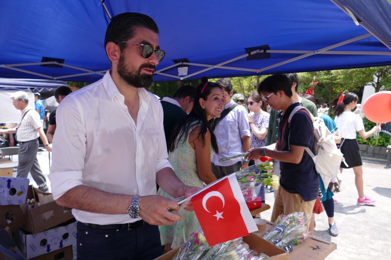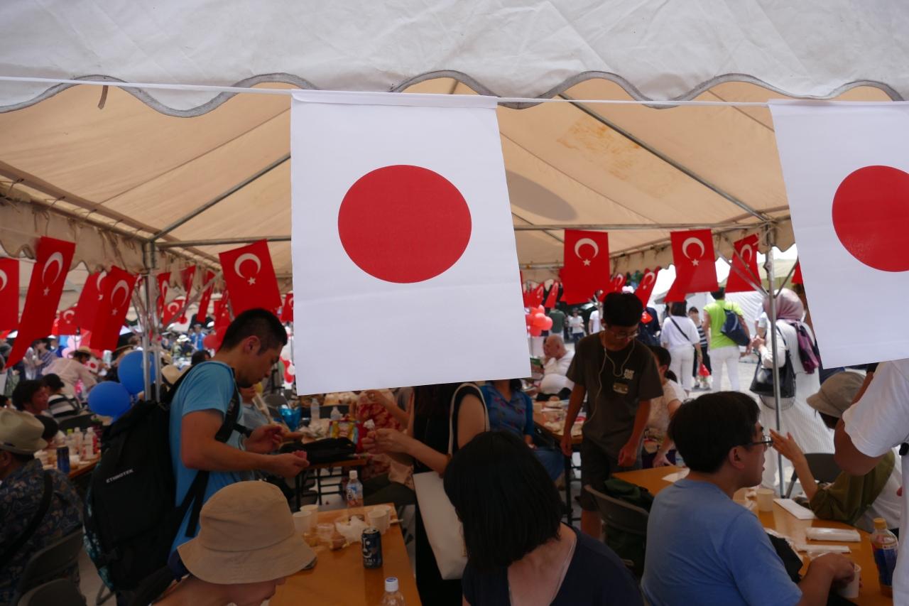 入り口近くのテントでは、トルコと日本の旗を配っていた。
