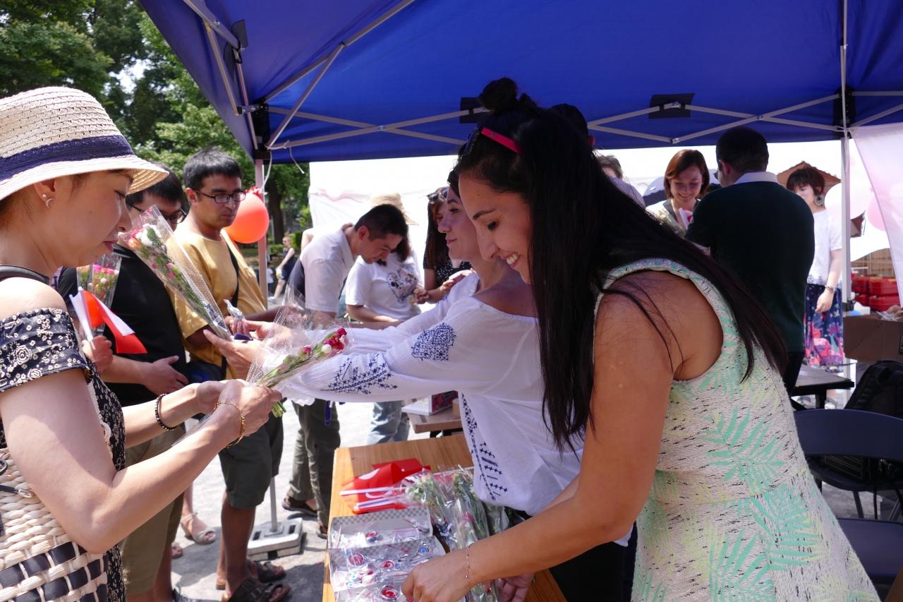隣ではトルコから空輸された花が配られ、女性の方々に好評であった。