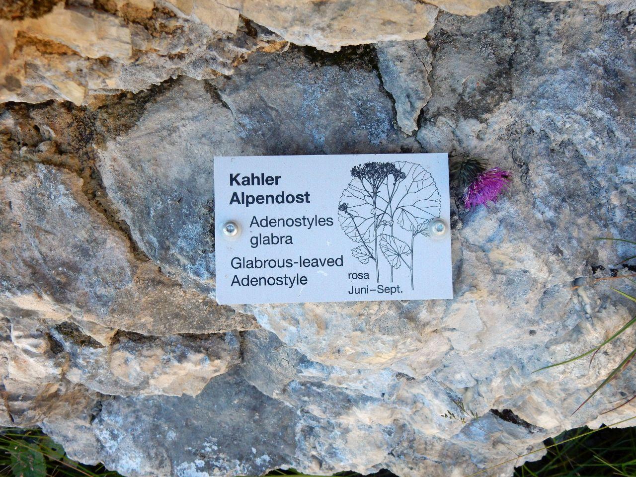 先に書いたように、トムリスホルンまでのハイキングコースは「花の道」と呼ばれていて、このように、花の名前や開花時期を書いた標示がしてある。