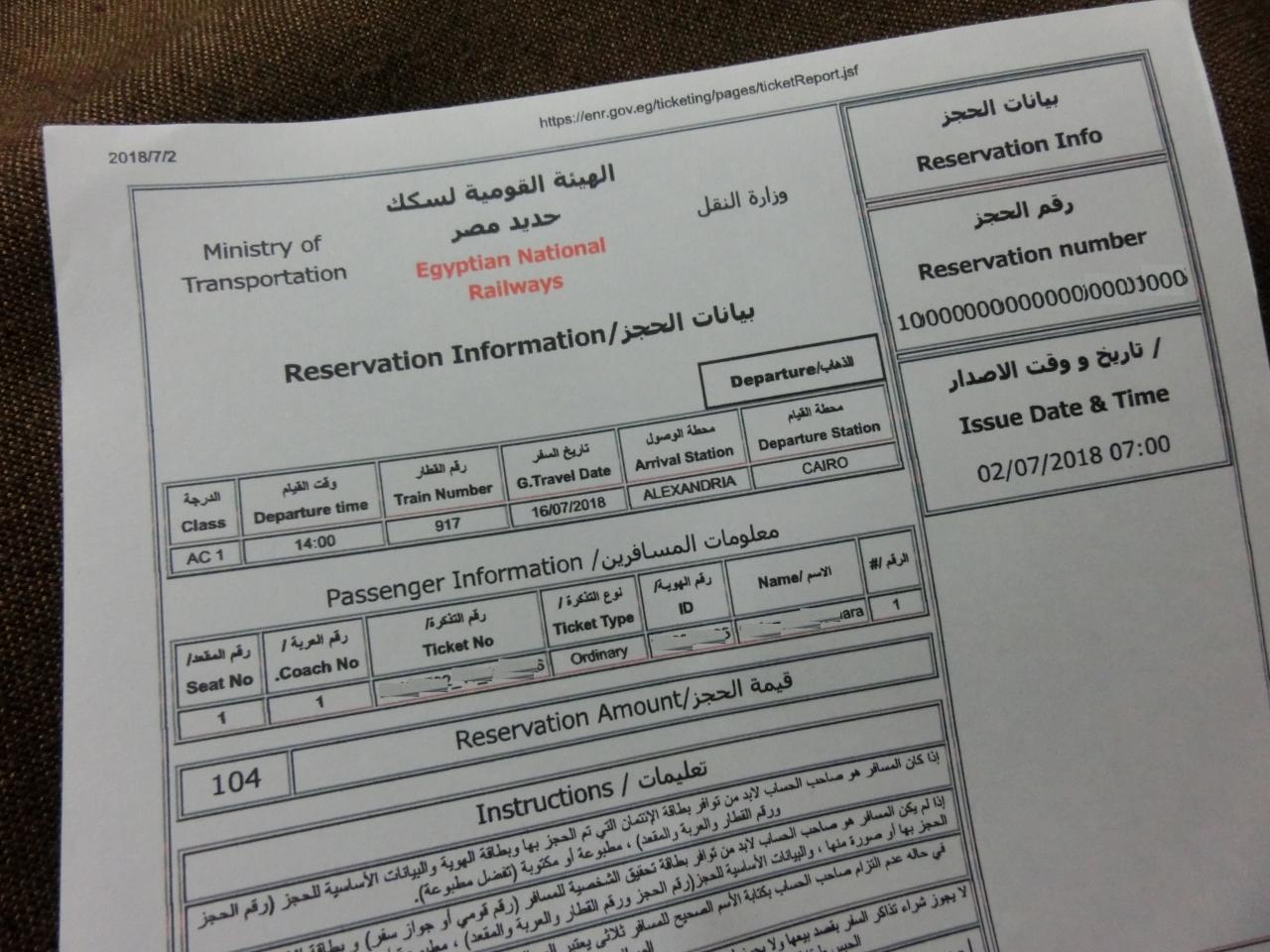 カイロ→アレキサンドリアの鉄道は、一等だと快適そうですね!