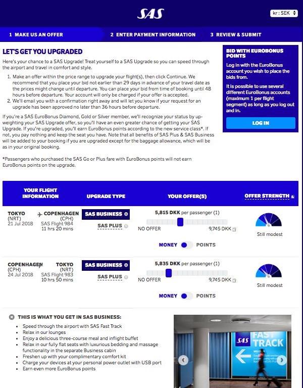 SASで購入すると、SASのページのアップグレードに入札というページがあるので、そこで、予約番号と名前を入れるとこのページに入れる。
