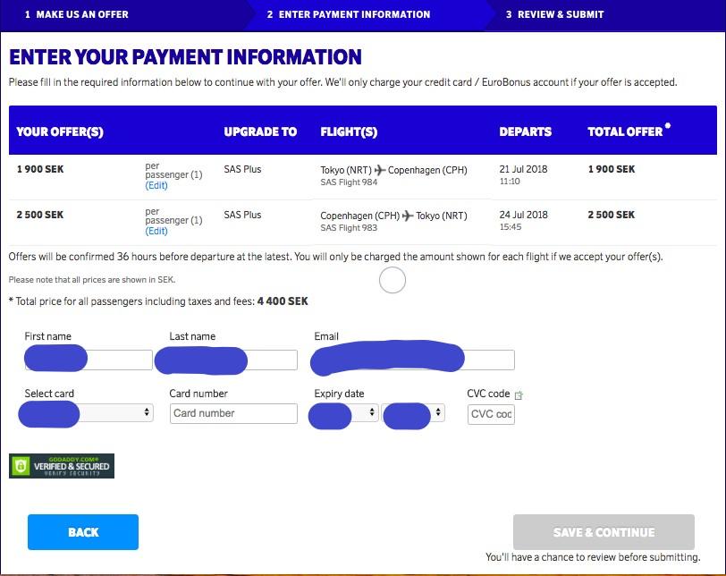 行きと帰りの便と最初はビジネスになっているので、プレミアムエコノミーならSAS PLUSのラジオボタンをチェックしてバーを好きに動かして入札額を決める。