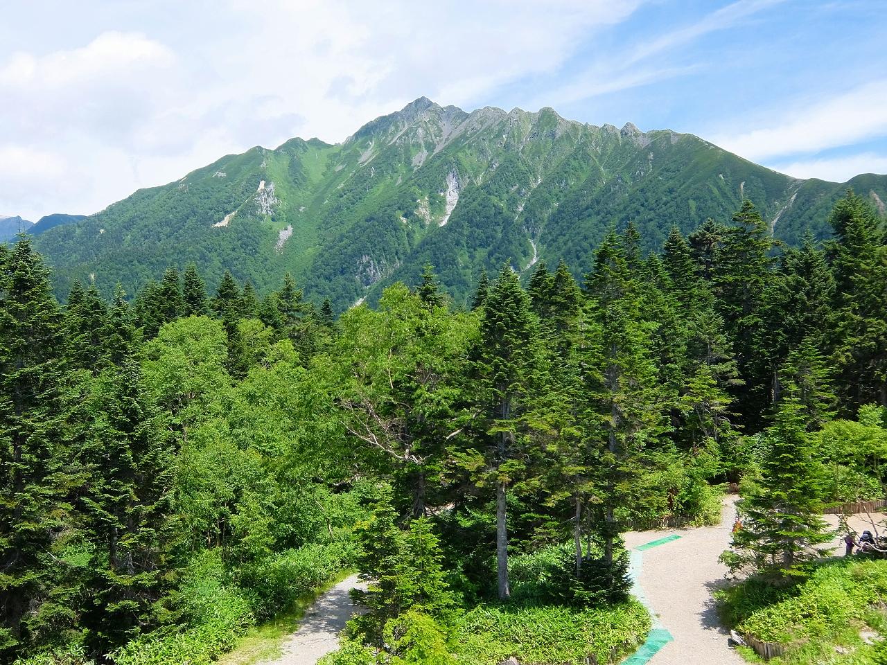有名な観光地の上高地、中央の建物近くに河童橋があります。