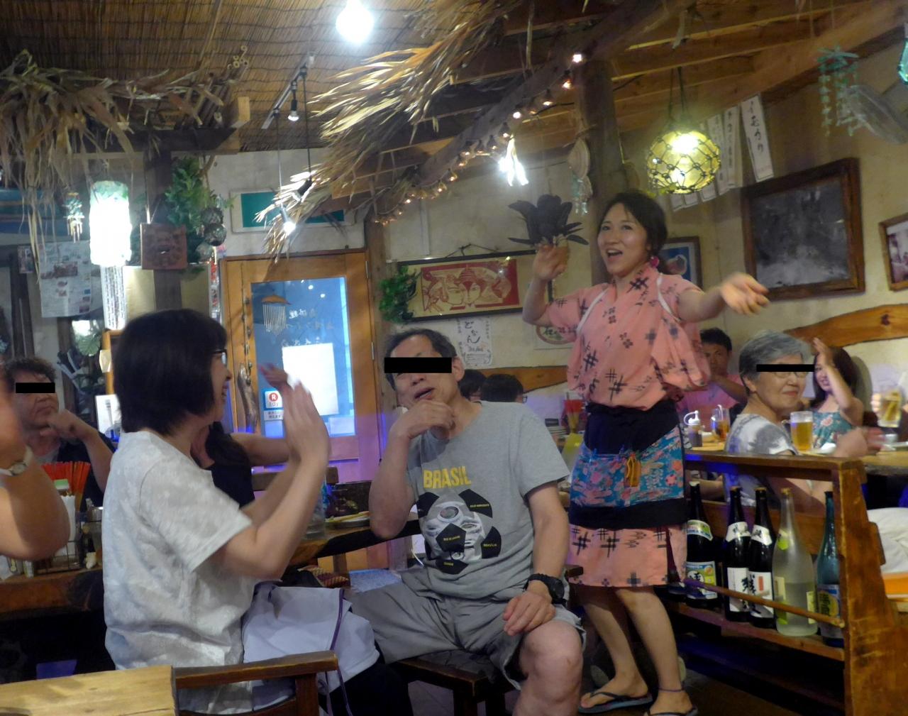 2018.7フィンランド人と一緒に西表・石垣旅行11-うさぎや新館で島唄で大騒ぎ オジー自慢のオリオンビール...