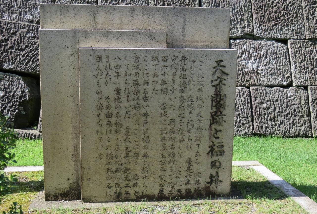 『天守閣跡と福の井』のタイトルがあった説明パネルの光景です。モニュメント風に三段に石が並んだデザインでしたが、正直なところ、内容、デザイン共に少し野暮ったい標識でした。