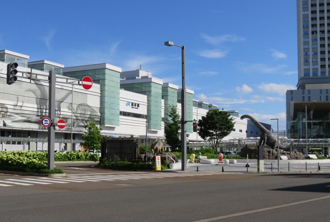 ズームアップした、JR西日本の福井駅駅舎の建物光景です。壁面に恐竜の図が描かれていました。1982年(昭和57年)に勝山市北谷の杉山川流域で、中生代白亜紀前期のワニ類の全身骨格化石の発見が契機となり、恐竜のほか、ワニ、カメ、魚類、淡水生貝類、陸生植物などの化石が見つかりました。日本の恐竜研究のメッカです。これで、福井県の4箇所のうち2箇所の続日本百名城の紹介はお終いです。
