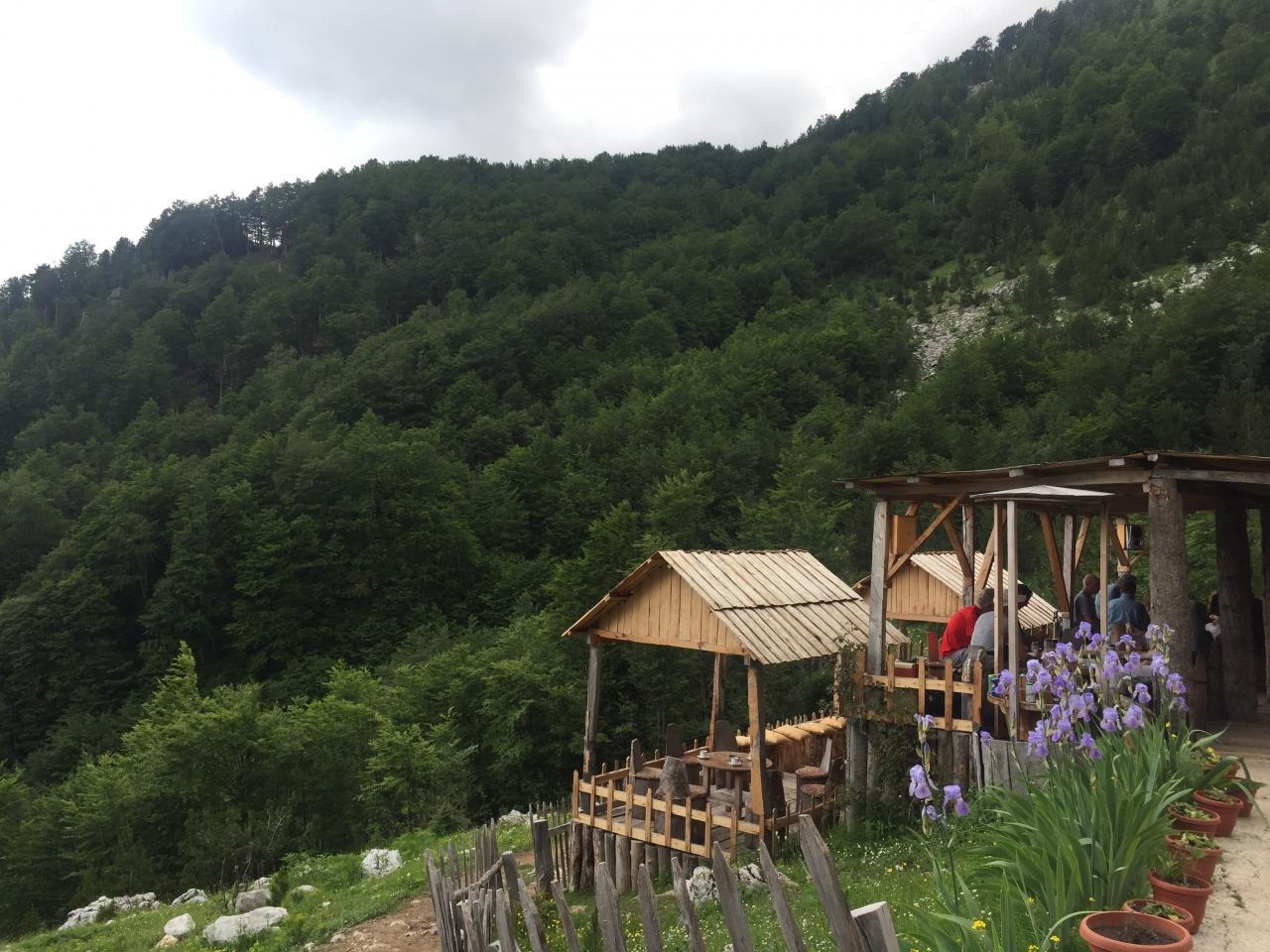 1時間後、 カフェ「Simoni Kafe」に到着。Journey to Valbonaはこのカフェをロビンソン・クルーソー風と形容。山の水で冷やした缶ジュース(200Lek)やチャイ、コーヒー(200Lek)などを提供していた。