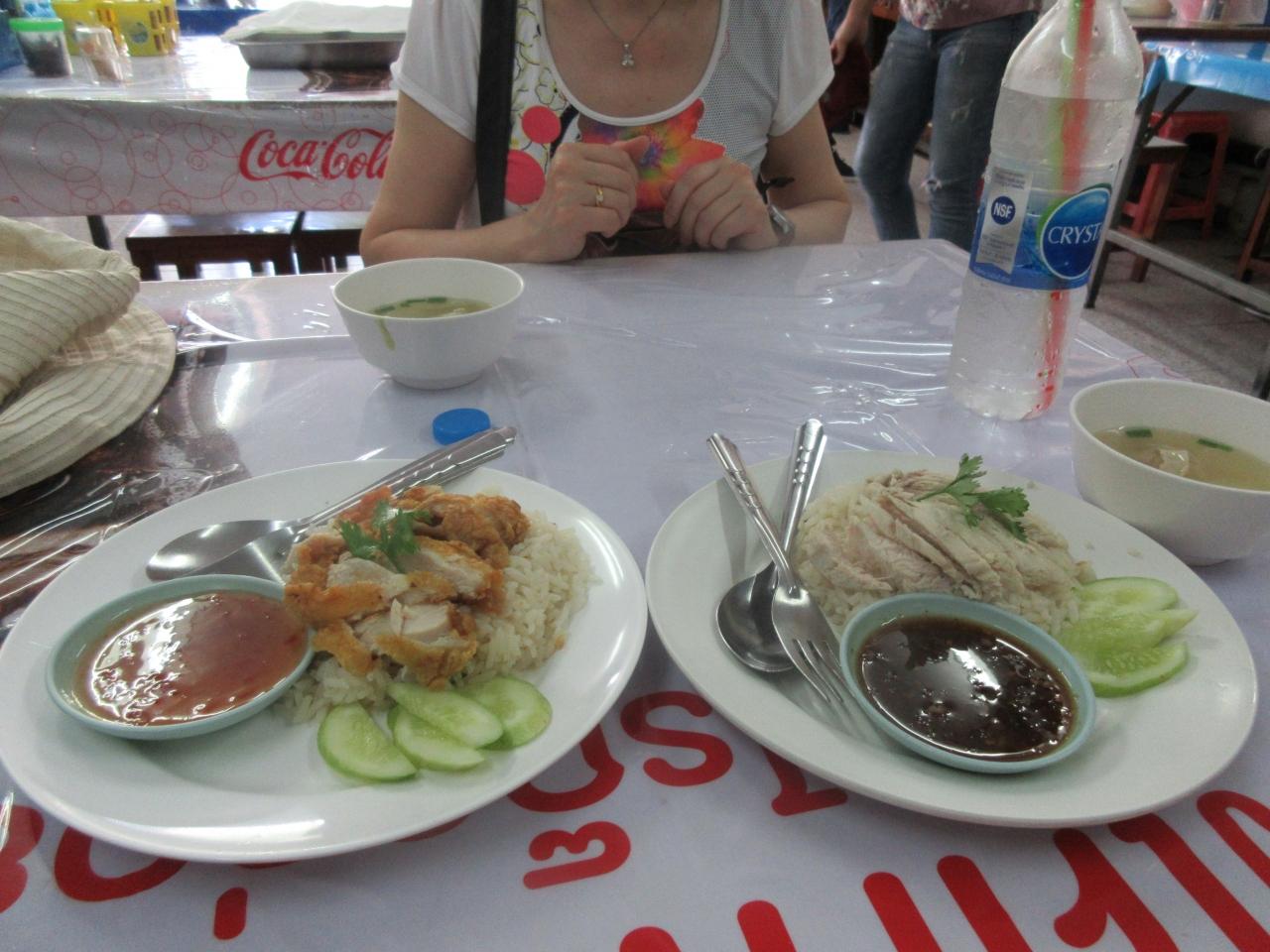 バス停のそばに、緑のどんぶりマークの付いたカオマンガイ屋が