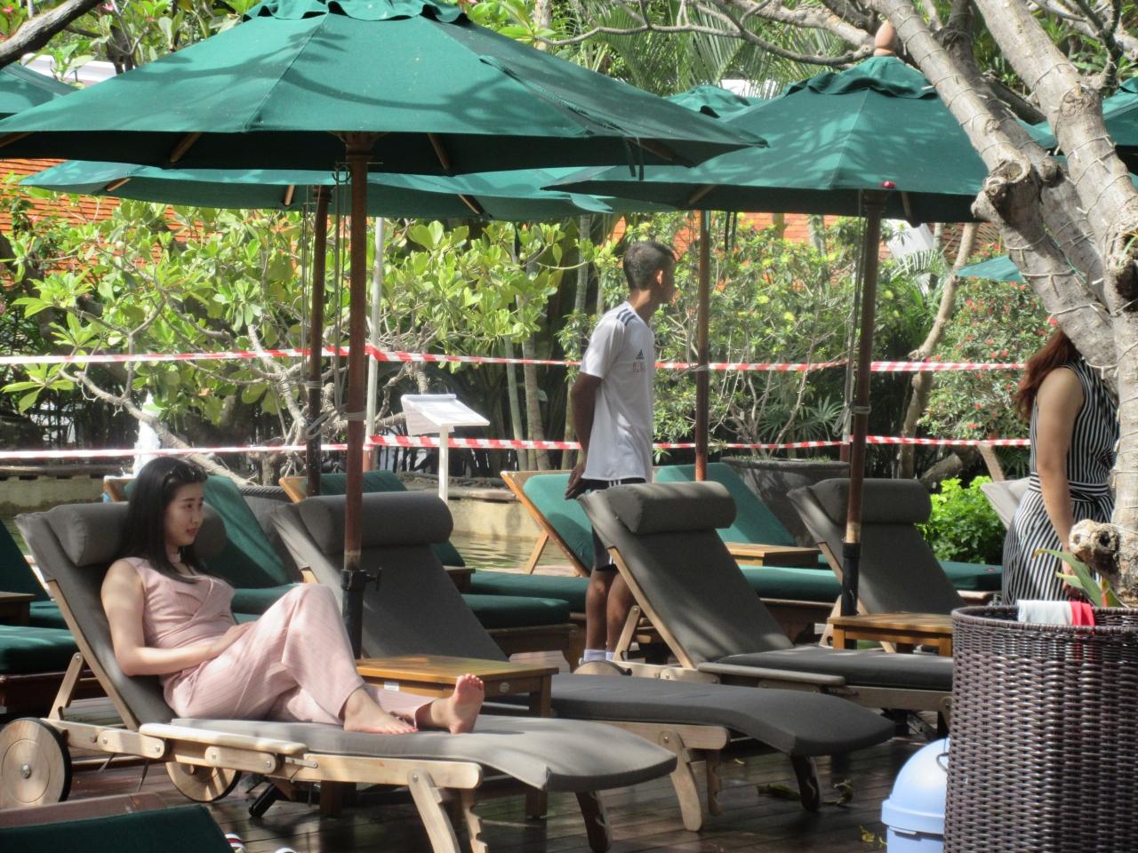 プールサイドで休憩しつつ、夕食の場所を検討します。