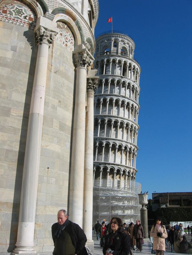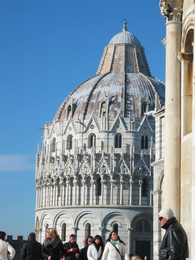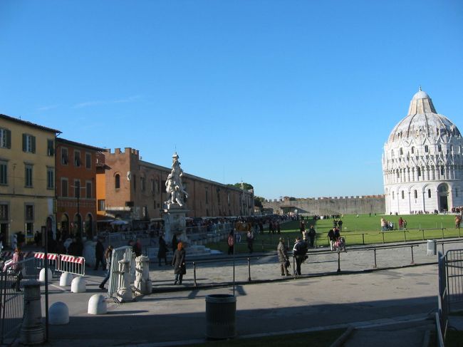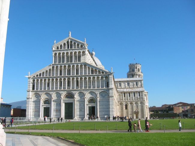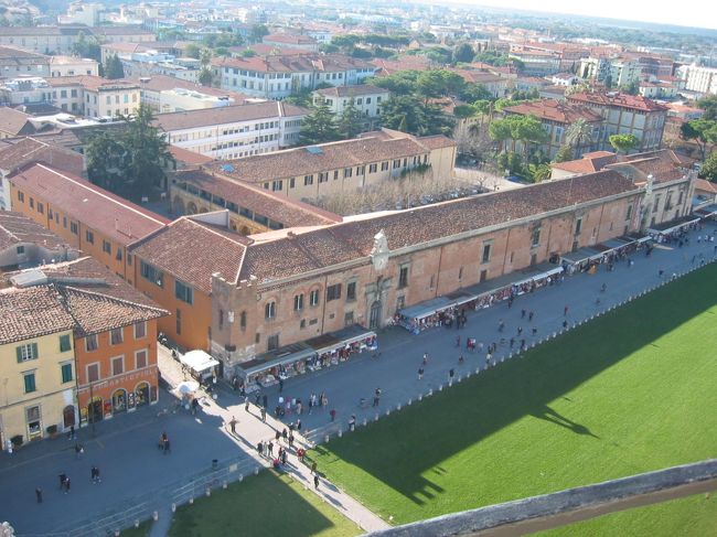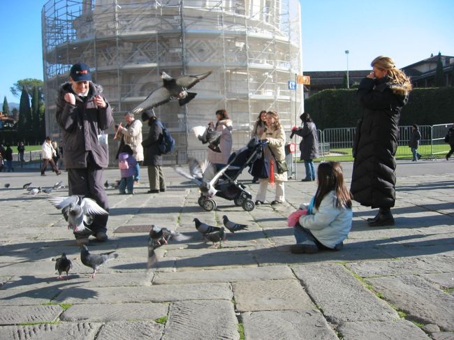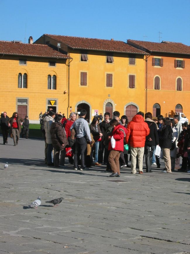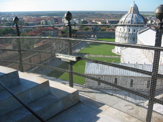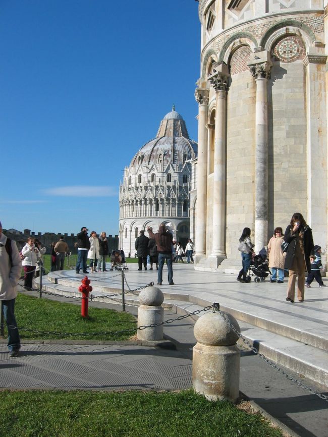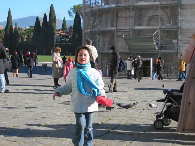 フィレンツエに2泊した次の日は列車でピサに行ってみました。すごく天気が良くミサの斜塔は多くの観光客でにぎわってました。フィレンツェから列車で1時間でピサ中央駅に、その後、1.5K位歩いたところにピサの斜塔はあります。まだ娘が小さく(今は大学生)登れないと言われましたが、年齢は足りていたので何とか許可を得ました。