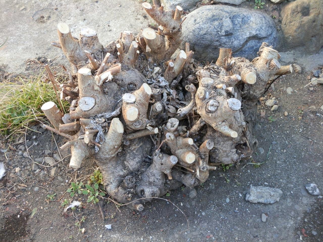 小川町和紙体験学習センター内に植えられている楮(こうぞ)の木です。楮を使用する為、切り取った跡です。