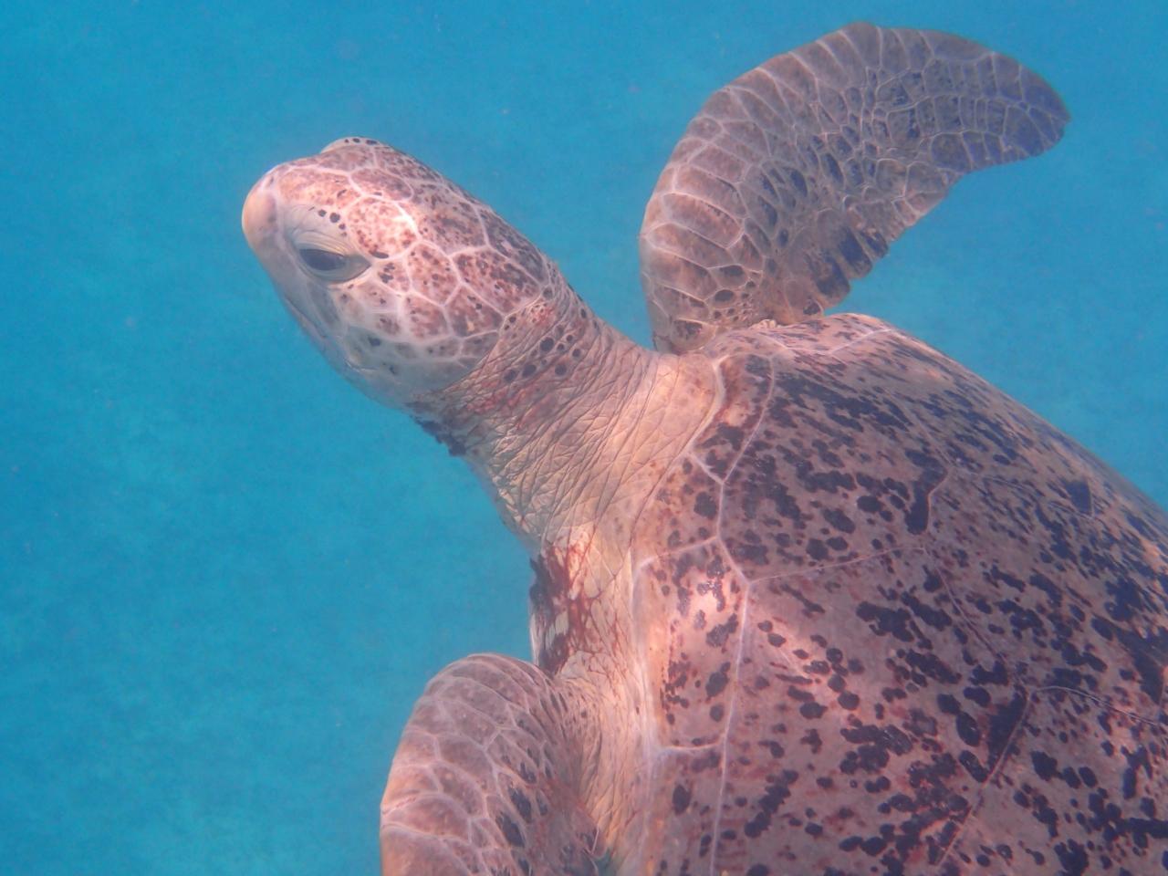 タートルポイントでは餌付けをしたウミガメを見ることができます。普段は海底にへばりついていて、潜らないと近づくことはできませんが、呼吸時に海面に浮上してくるので、そのチャンスを狙います。