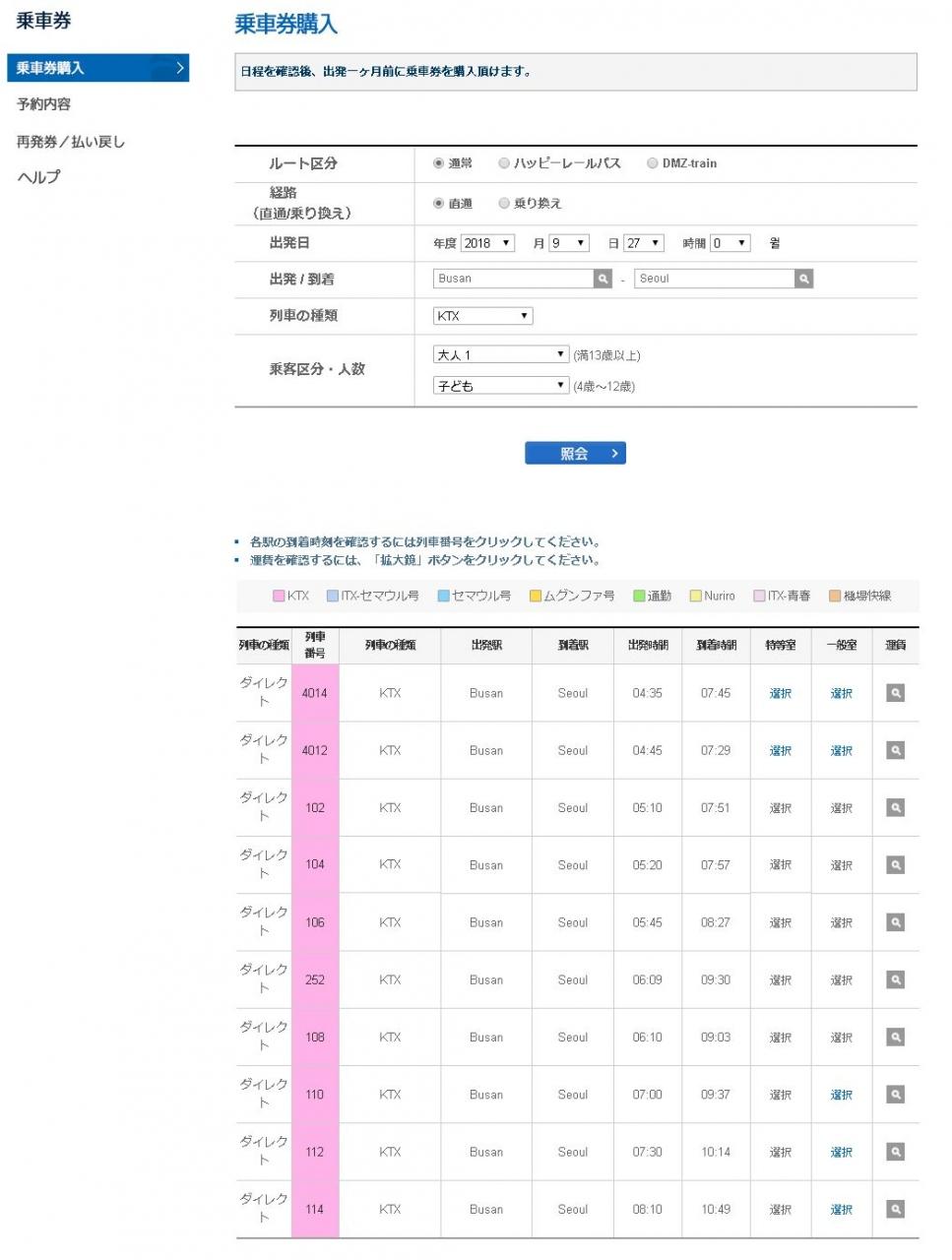 ちなみにソウル~釜山間は行きのピークが9月22,23日ごろが終日満席、帰りは26日が満席になっていた。写真の画面は釜山発ソウル行きKTXの27日分で早朝ならまだ席が選択できる状態(選択という字が青い部分が予約可)。