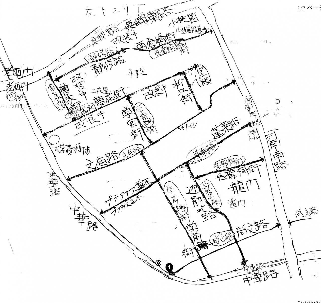 地図・旧県城内を河南南路と復興東路で4分割した左下部分です。大部分が古い住宅を撤去するので無く、竹の足場を組んで改装し、街並みを保存する為の工事の真っ最中です。壁を白く塗っています。