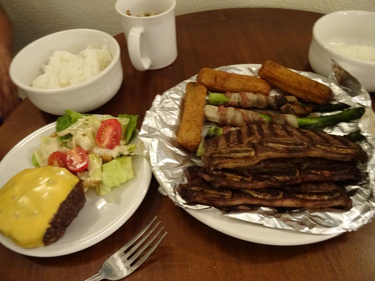 今日の夕飯。アラモアナのフードランドでハンバーガ、骨付きカルビ、アスパラのベーコン巻きを買ったので焼いて食べます。