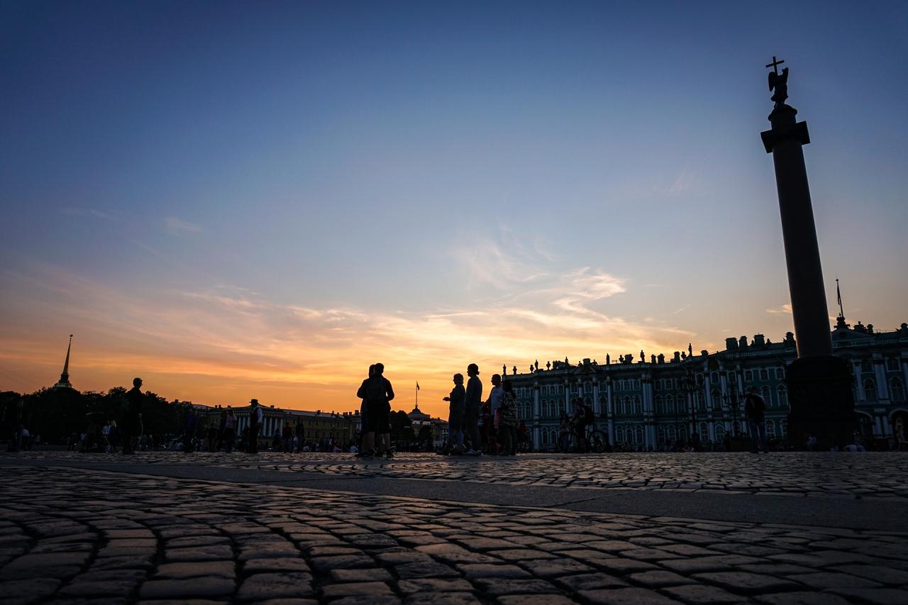 美しい色に包まれた、サンクトペテルブルグ。道の先には旧海軍省が。