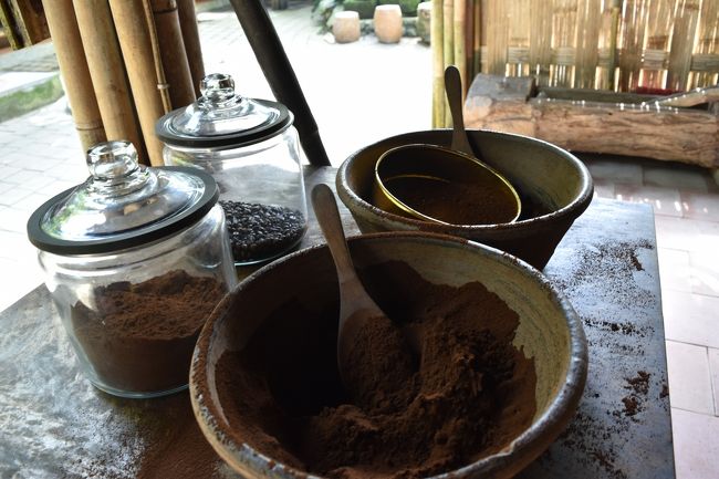お次は話の流れで行くことになったルアックコーヒーのお店。ルアックコーヒーのお店はたくさんあるけれど、雄豆と雌豆のコピ・ルアックはここだけらしい。コーヒー豆に雄雌があるなんて初めて知りました。雄は一粒のまるい豆、雌は二つに割れ目のある見慣れた豆で雄豆は貴重なんだそうです。お店の方が日本語で説明してくれます。