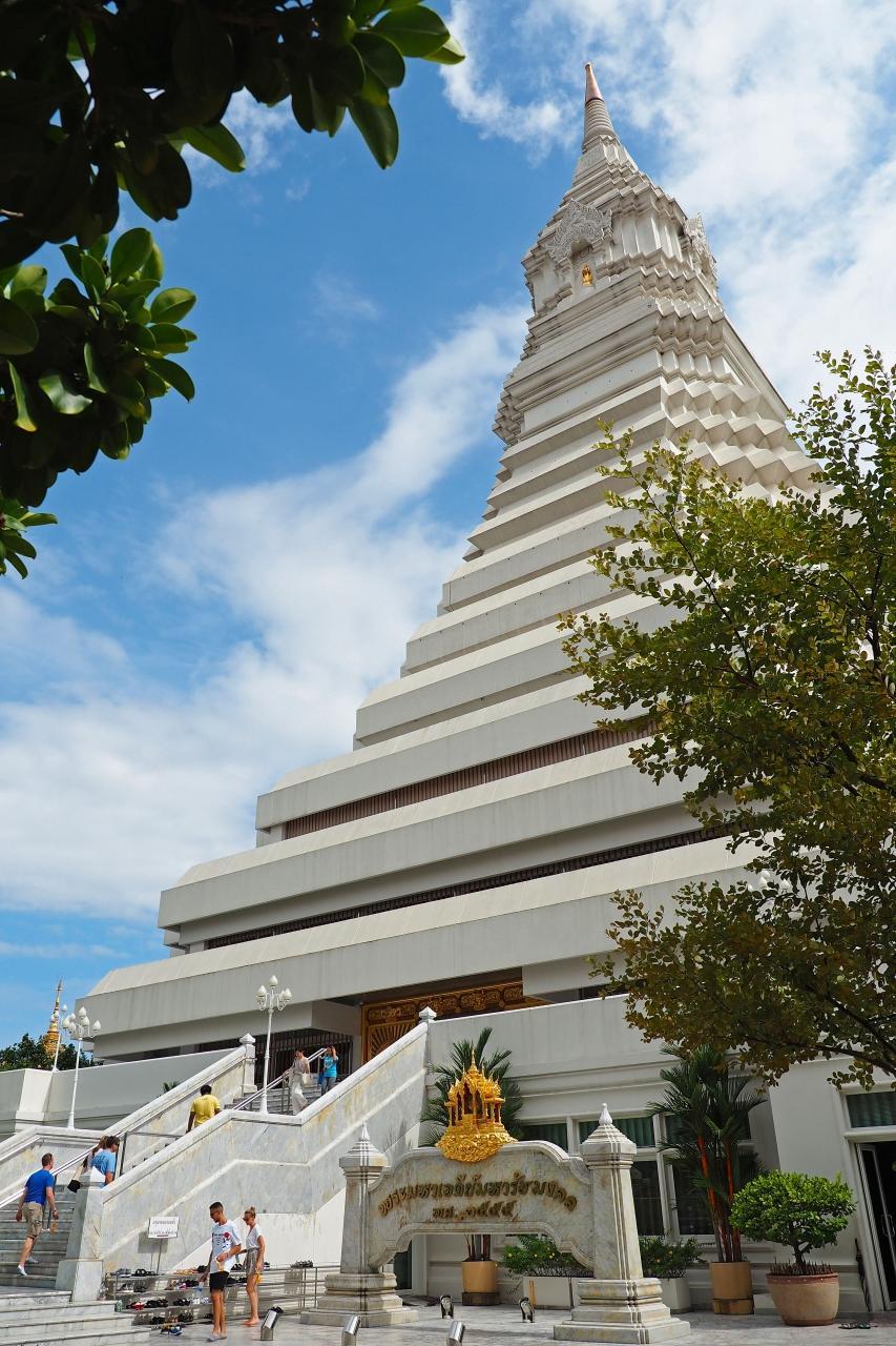 外に出て中央のお堂を見ると、白い狛犬に何重にも重なった特徴的な多層屋根はまさにビルマ様式。