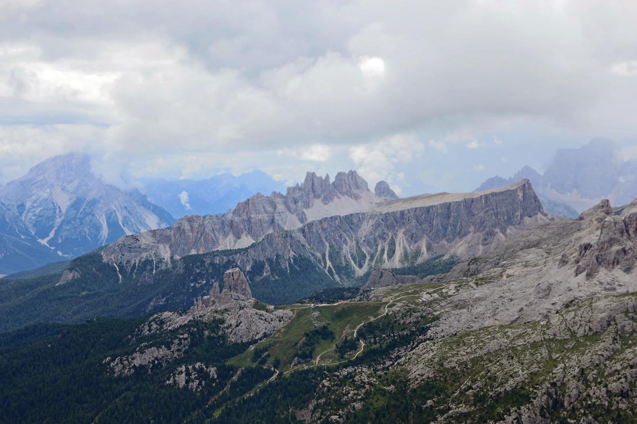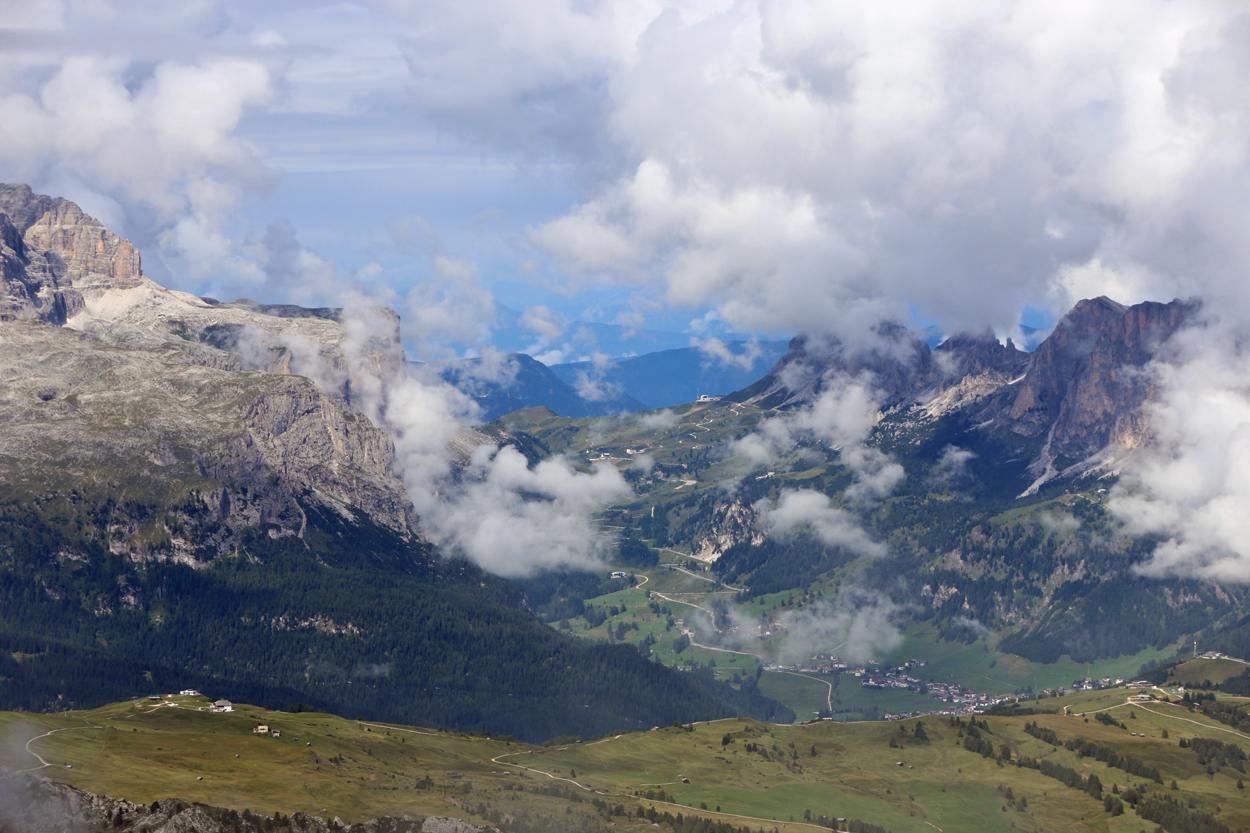 奥はセッラ山群、南(左側)はポルドイ峠、北(右側)ガルデーナ峠。 -