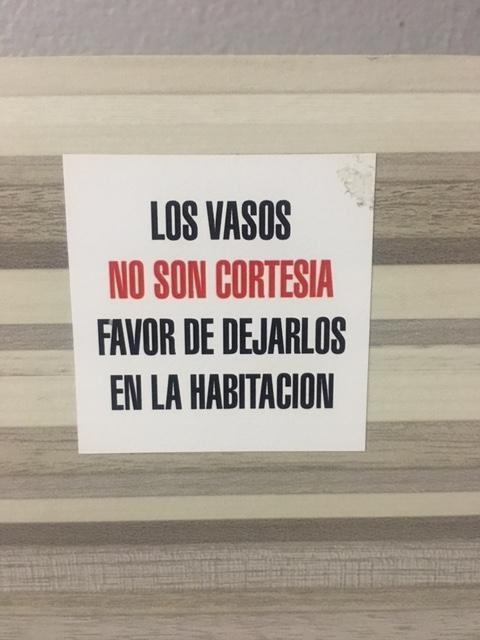 手を洗おうと洗面台に立つ。鏡には「避妊具はレセプションで販売しています」のスペイン語。そして、ガラスコップは、サービス品ではないので、持ち帰らないでくださいの文字(笑)