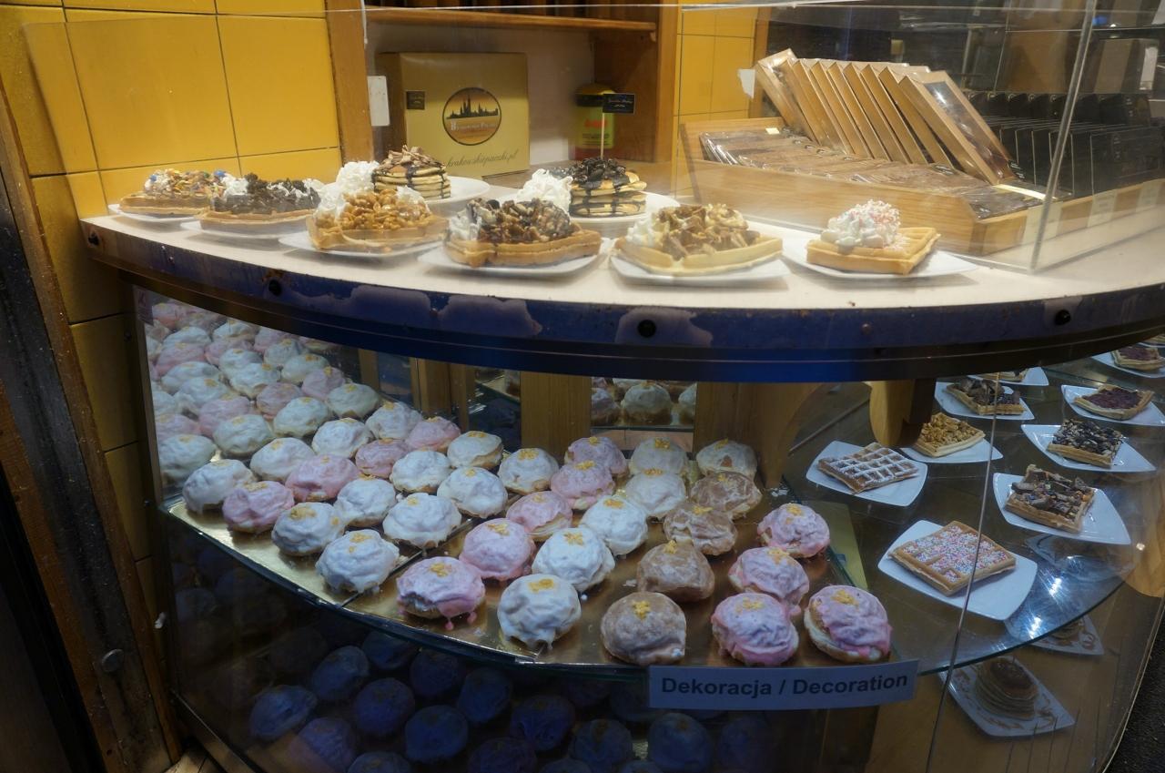 ポーランドのドーナツ「ポンチュキ」5ズロチ(177円)ポンチュキは丸い生地を揚げてあり、外側にはアイシングとオレンジピールがまぶされ、中にはバラジャムが入っている。食べ応えあるしっかり目のドーナツ。