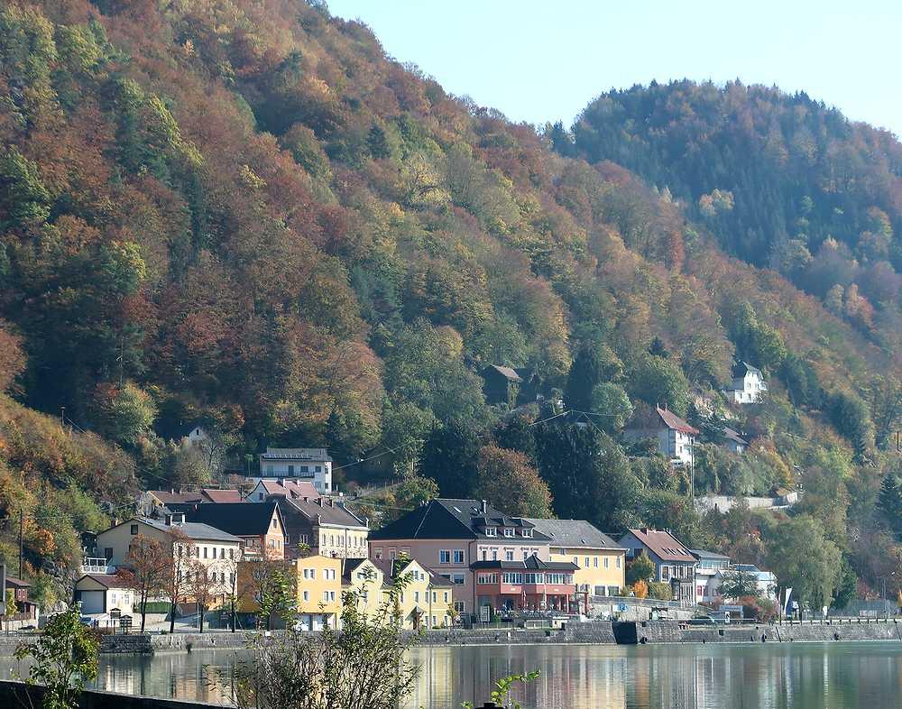上記の町を通り過ぎてから振り返って撮影。背後の紅葉も見頃だ。