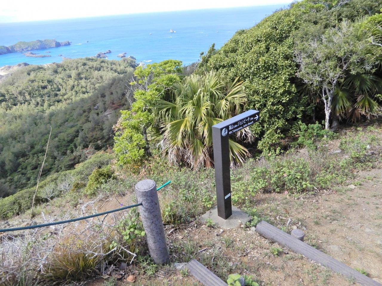 ベンチで小休止しながら、次の行程を検討。左手に進めば高山経由でジョンビーチ、2.3Km。右手に進めば高山山頂を迂回してジョンビーチ、1.9Km。疲れはなく、時刻は11時。看板の地図によれば、ここから高山までは約100mの登り道。それならば、答えはひとつ。 -