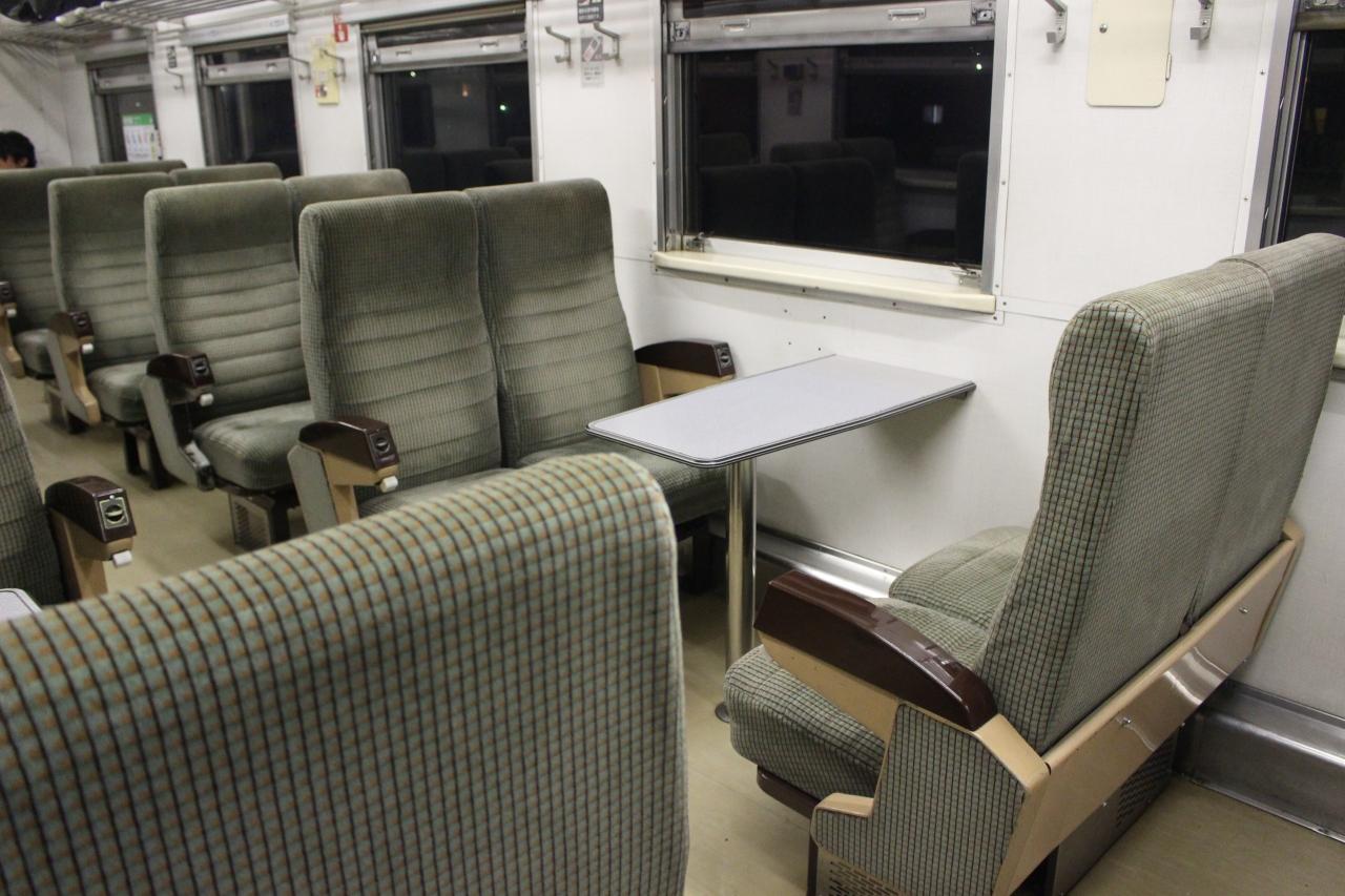 列車は再びキハ54形。中央部のテーブル付きボックス席を挟むように2人掛けの椅子が連なる珍しい座席配置の車両です。