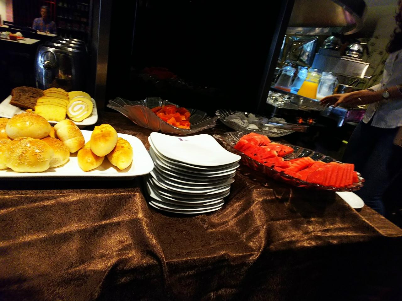 右側の赤いものはスイカ。中央奥はパパイヤ。左側の茶色いものは、甘い系のパンと、ロールケーキです。甘いパンはデザート扱い?(^_^;)