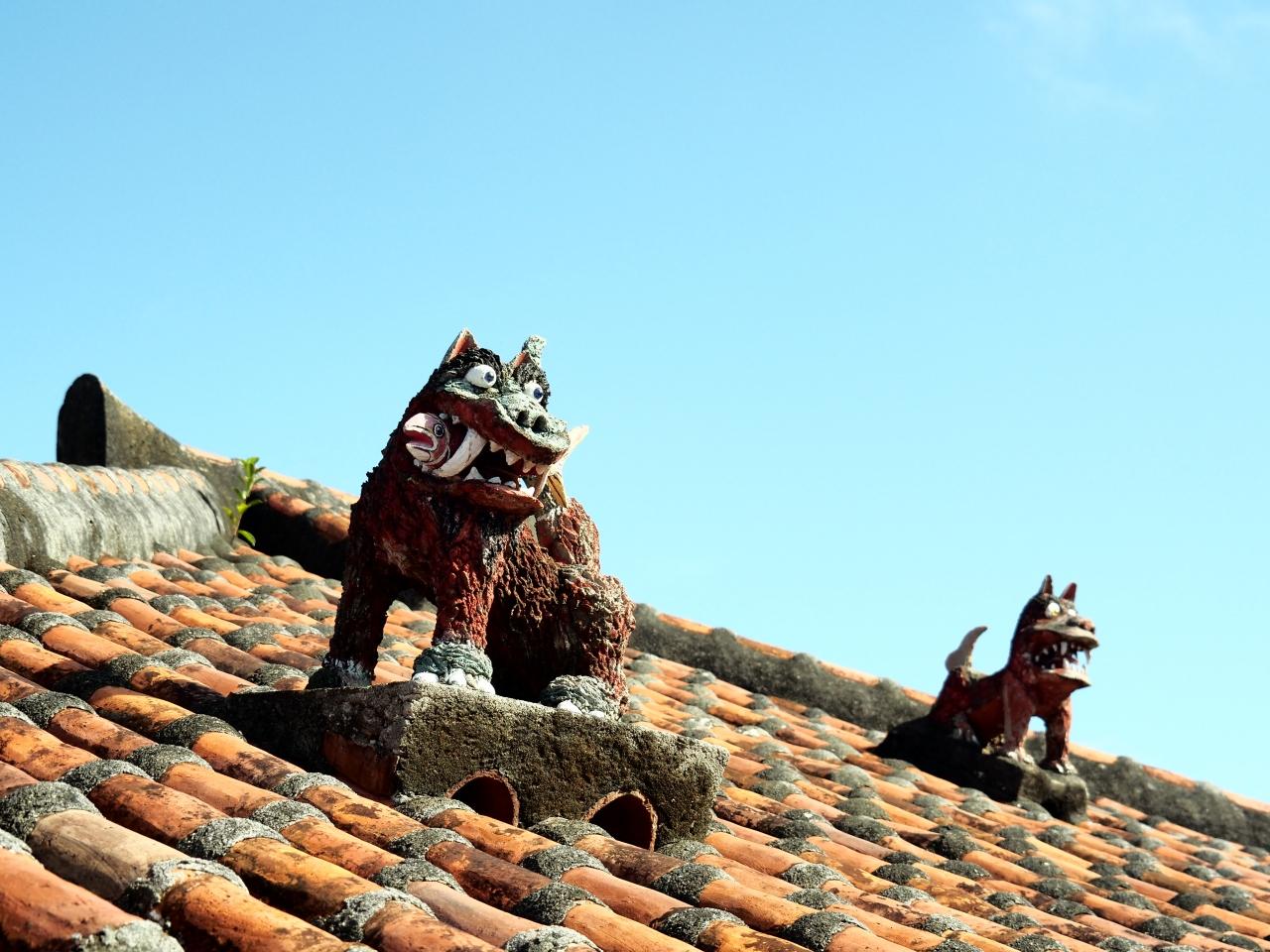 石垣島にやって来ました。泡盛を持ったシーサーがお出迎え
