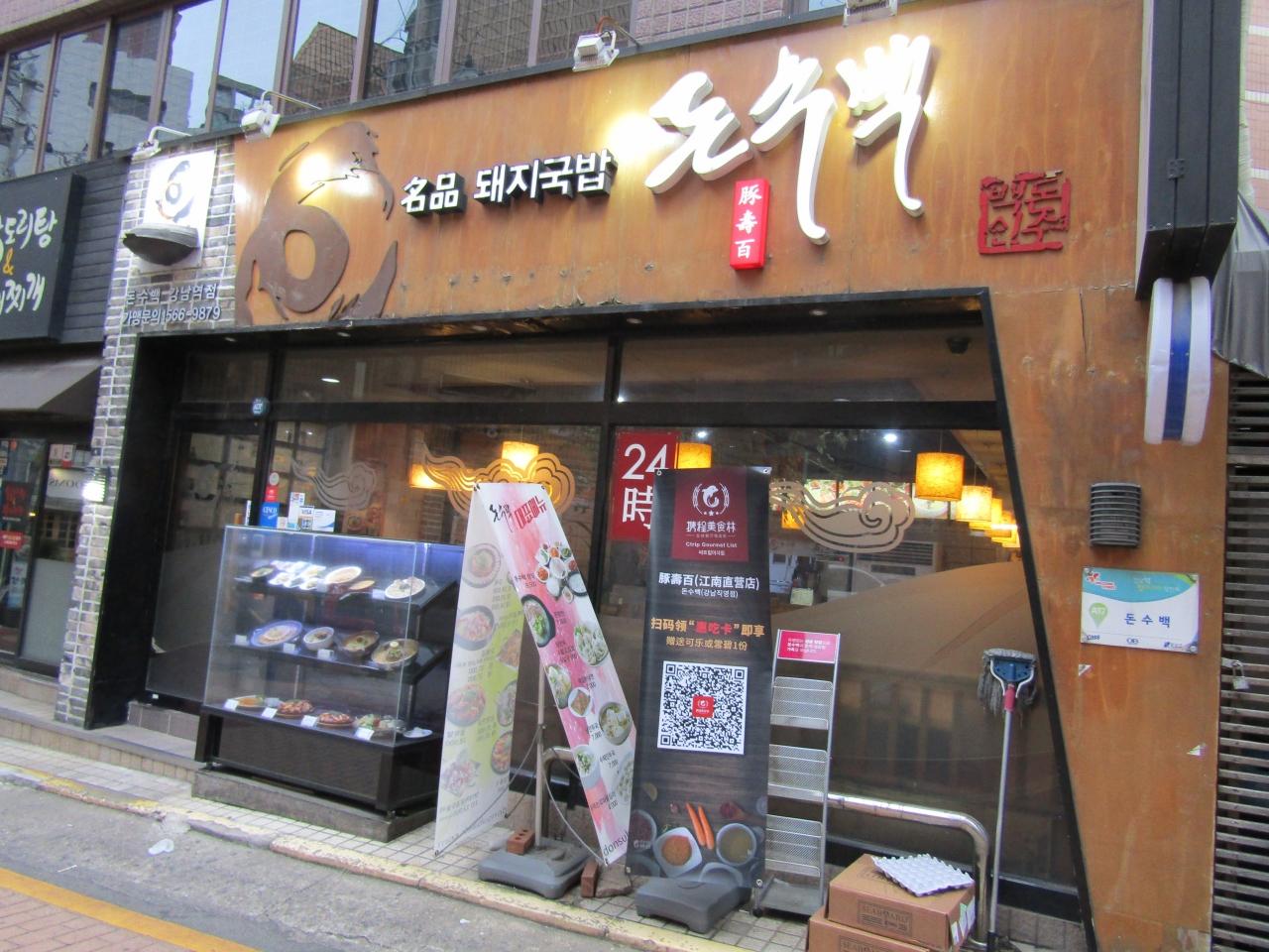 親切な警察官の方に横断歩道で工事中の道を案内していただき、渡ってアディダスビルの近くを曲がると、見えて来ました「豚寿百 江南直営店」。24時間営業のお店です。