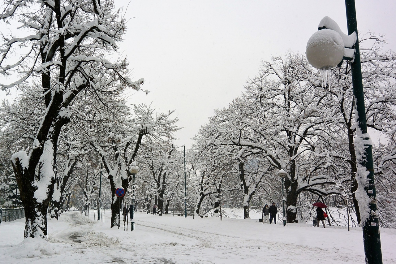 『Swiss Hotel Sarajevo』6階にあるスパ『Golden Rain Spa』のプールエリアからの雪景色。