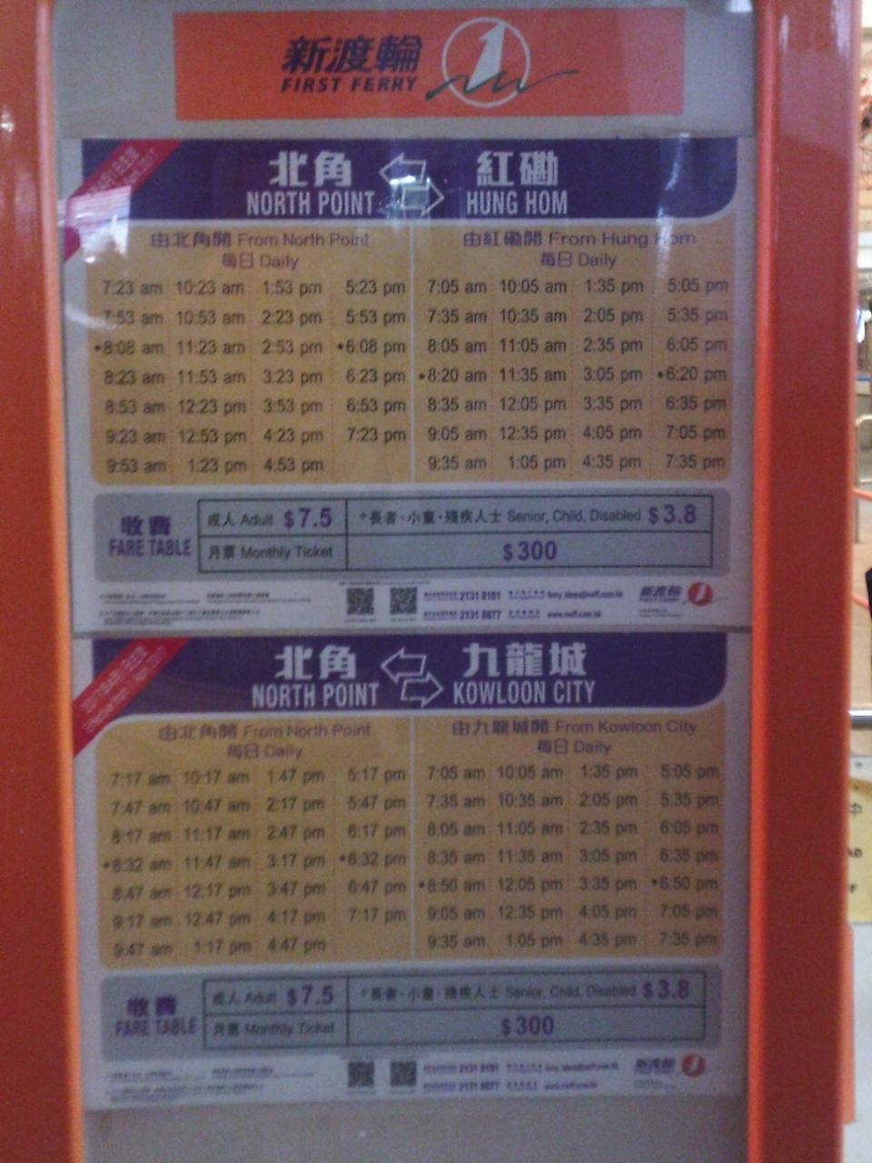 フェリーの時刻表。一時間に二便出ているようだ。 -