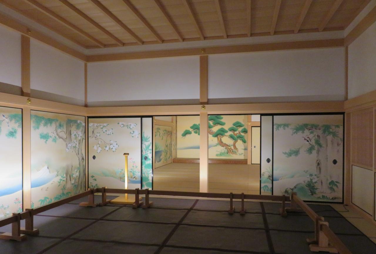 金箔地濃彩により雪中柳鷺図が描かれ、心引き締まる空間を作っていました。『長押(なげし)』の上の小壁まで障壁画が描かれているのが、この御殿が造られた『寛永期(1624~1644年)』の特徴とされます。素木板違貼格天井で、天井縁も黒漆塗となっています。この時代の 天皇は後水尾天皇、明正天皇、後光明天皇、江戸幕府は家光三代将軍でした。(同上)