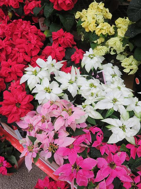 季節がら、いろいろなポインセチアが鮮やか。 -
