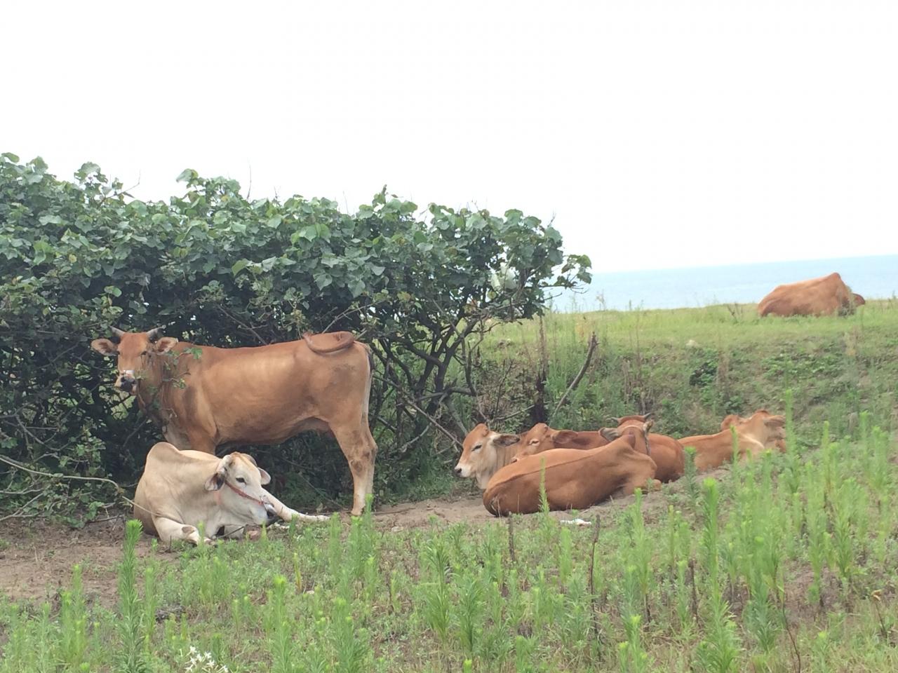 バイクで走行していると,牛に遭遇