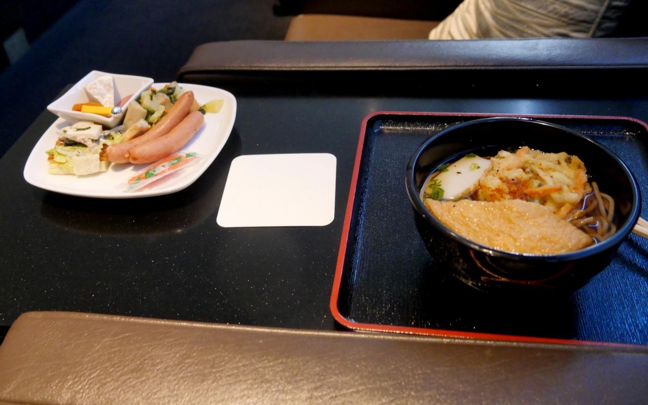 食事が出た このパスタ割とおいしい! 私は水とティーをもらう 飲み物を簡単に2回もらえる 一時期に比べサービス良くなったな