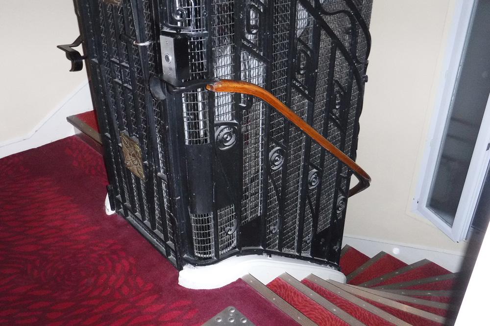 ここにはなぜか黒い金属製の縦長の籠があります。どうやら古いエレベーターのよう。お客さんは使えないようですが、業務用で使っているようです。