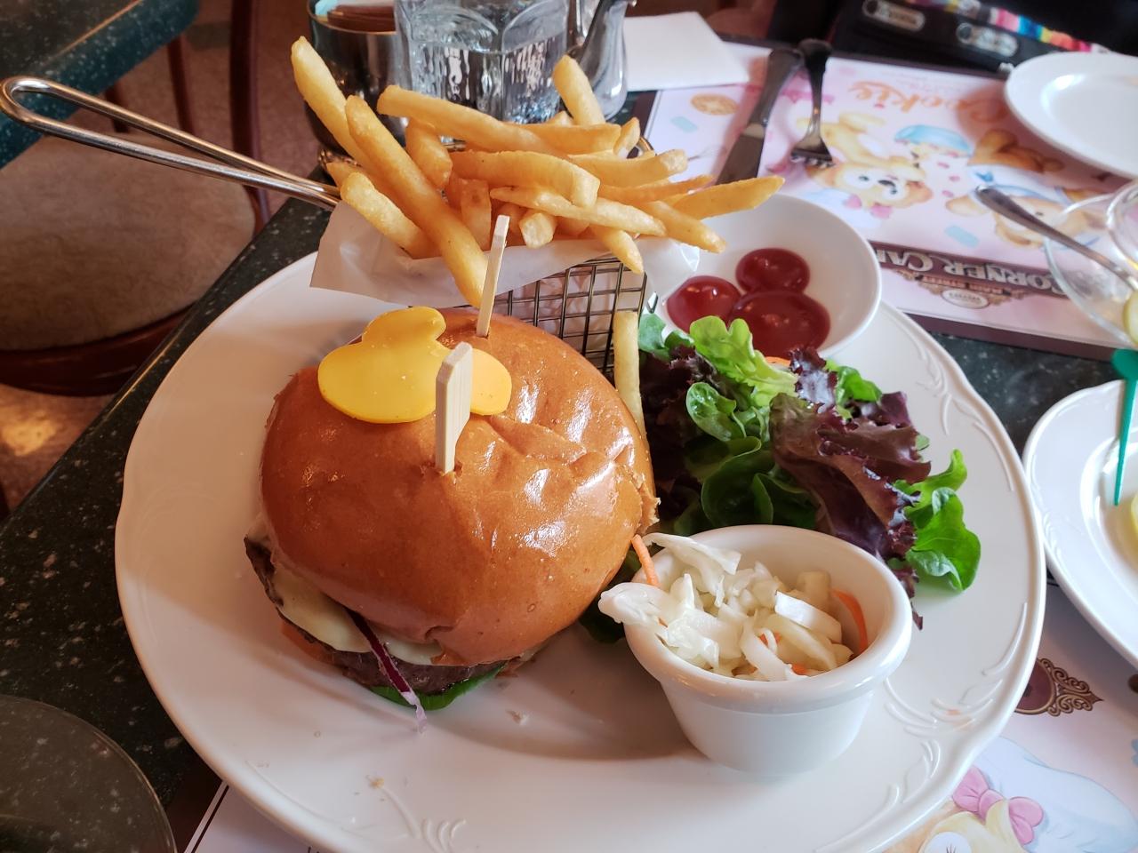 〈ハンバーガー〉は焼き方もチョイス出来ます。ミディアムレアでシェアするので半分にカットしてもらいました。〈チーズ〉や〈ケチャップ〉もミッキーシェイプでこだわっています。