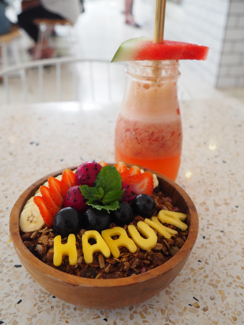 スムージーボウルのアルファベット部分はマンゴーなんですが、名前なり好きな言葉を伝えるとそれにしてくれます。私は名前を入れてもらいました。 -