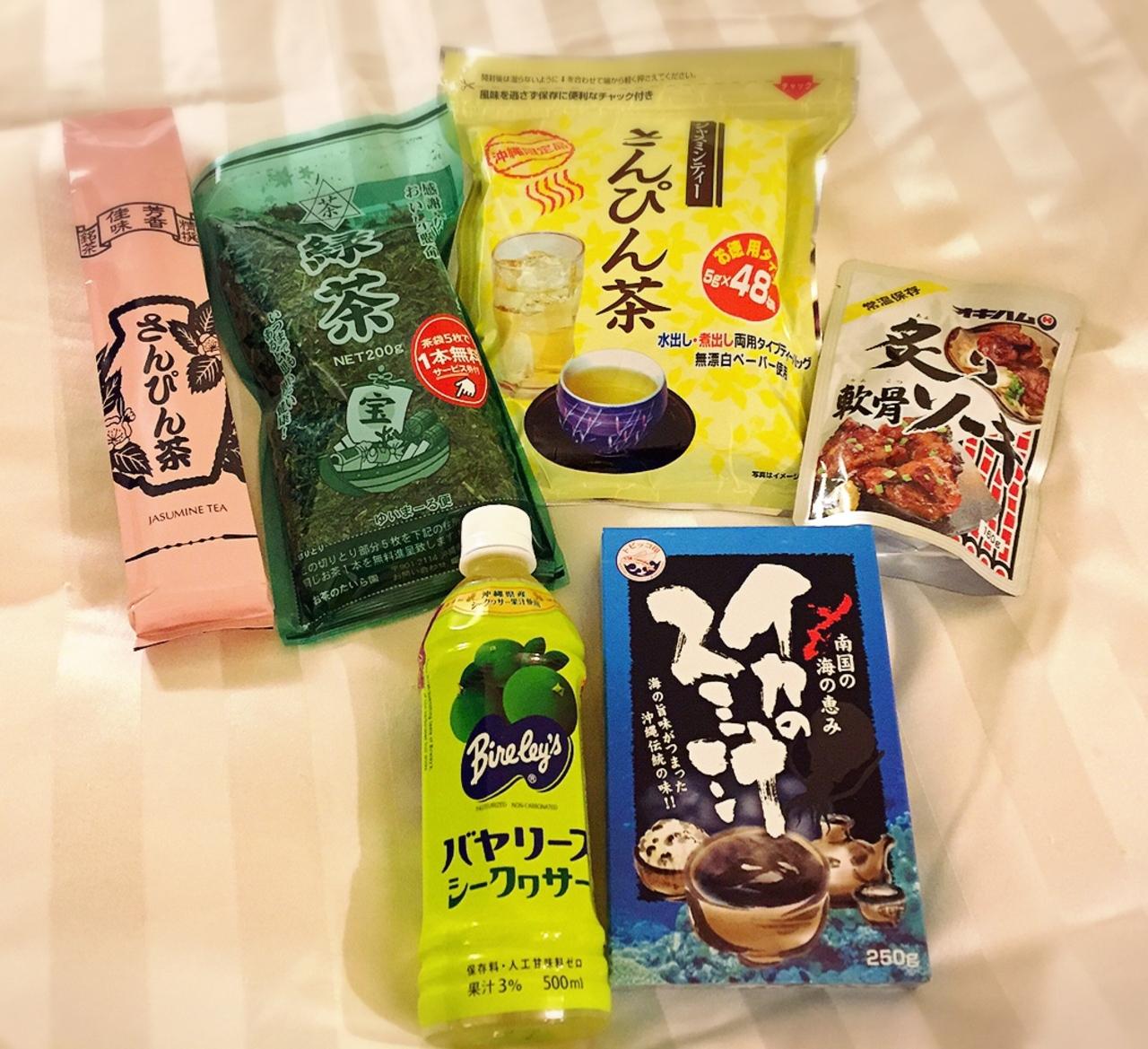 スーパーで購入したモノたち。気になってた「イカのスミ汁」も買えたし、自宅用のお茶も。