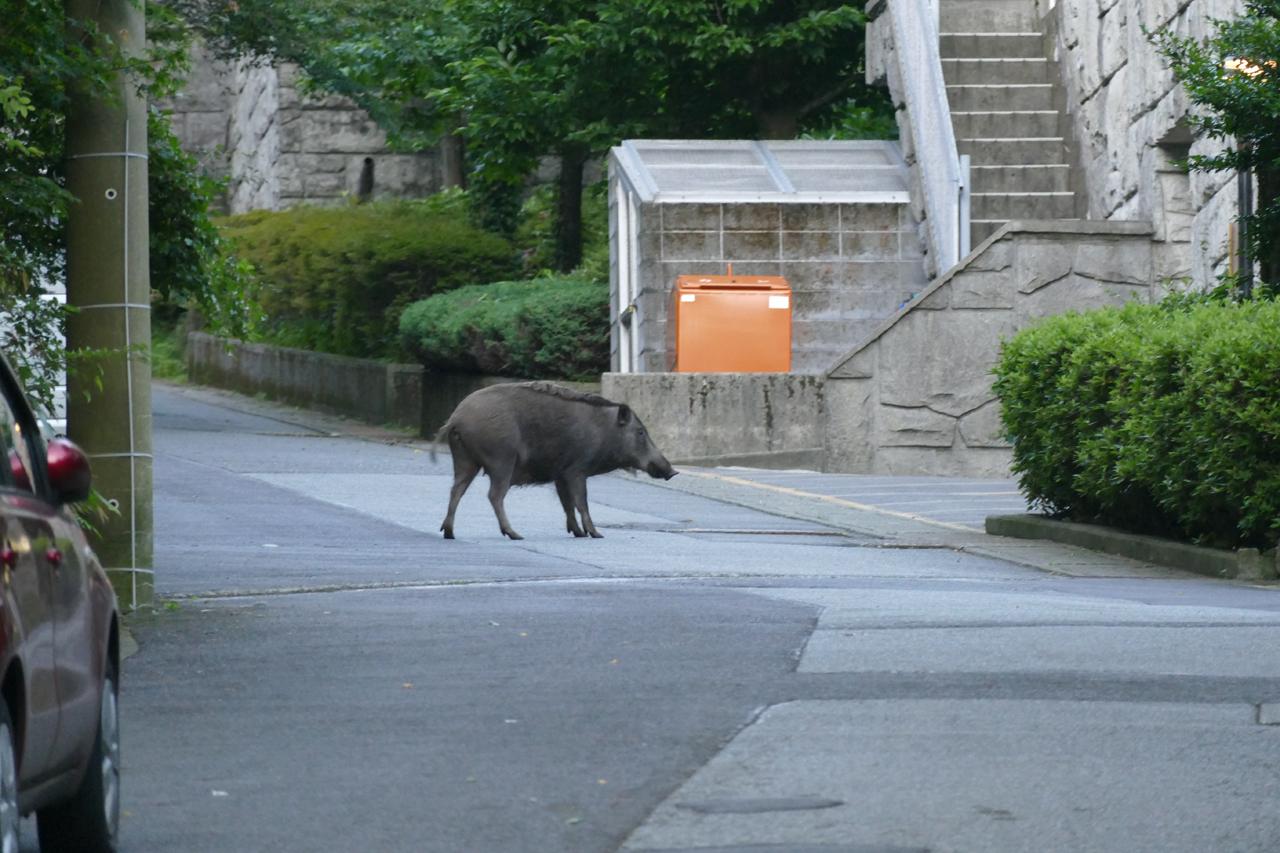 ホテル周辺を散歩すると大きなイノシシに遭遇。 -