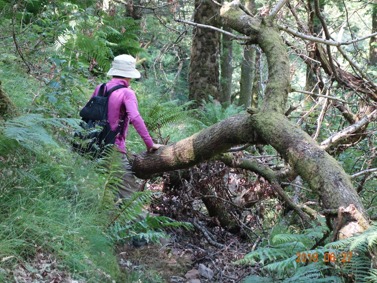 倒木をくぐり抜け、さらに足場は悪く