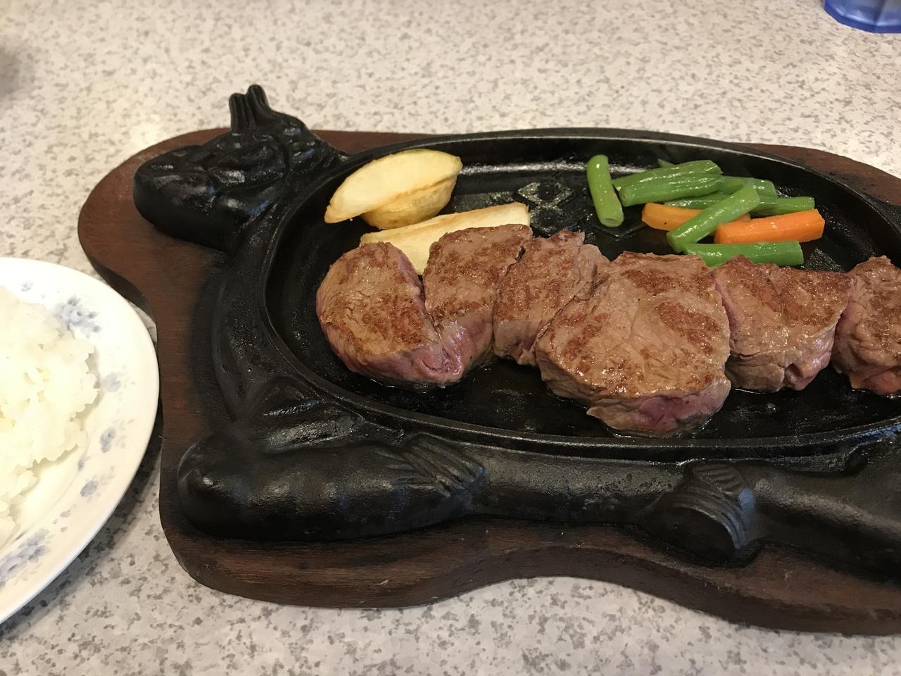 人気No.1「テンダーロインステーキ」200g 2300円 サラダ、スープ、ライス付き。