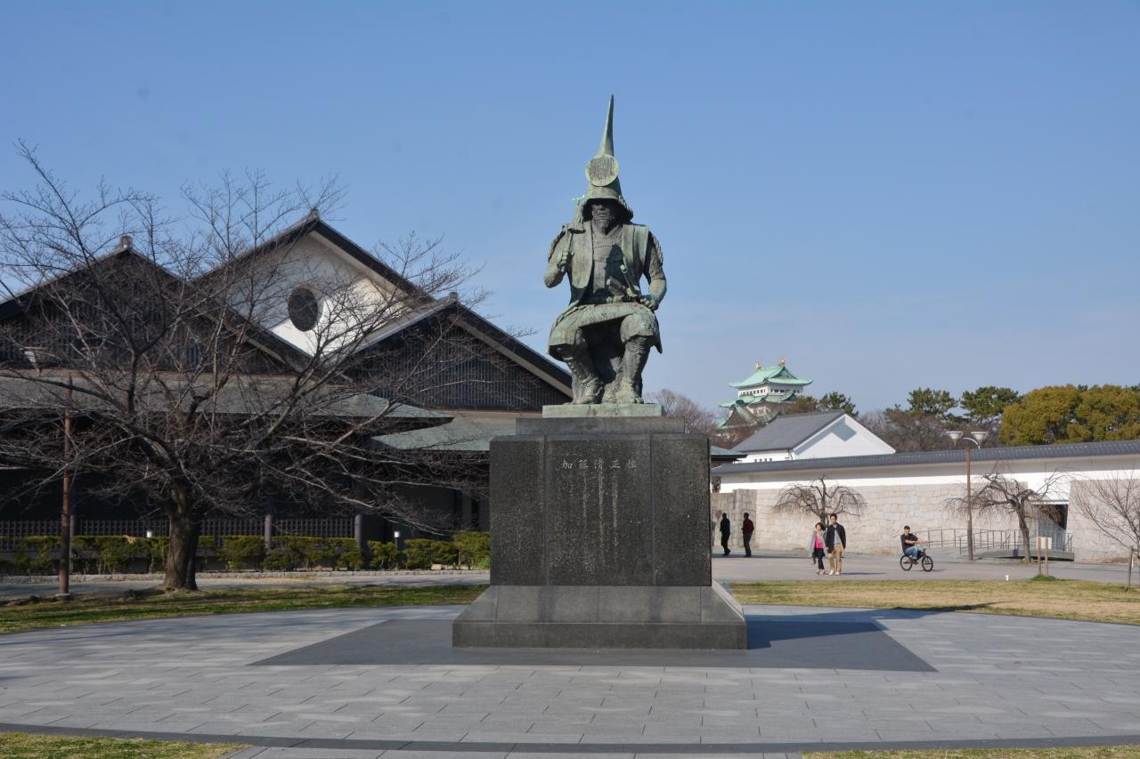 名古屋城南西の名古屋能楽堂南にある加藤清正像。名古屋では名古屋城を造った三河出身の徳川家康よりも尾張中村出身(現名古屋市中村区)の豊臣秀吉や加藤清正の方が人気があるようです。