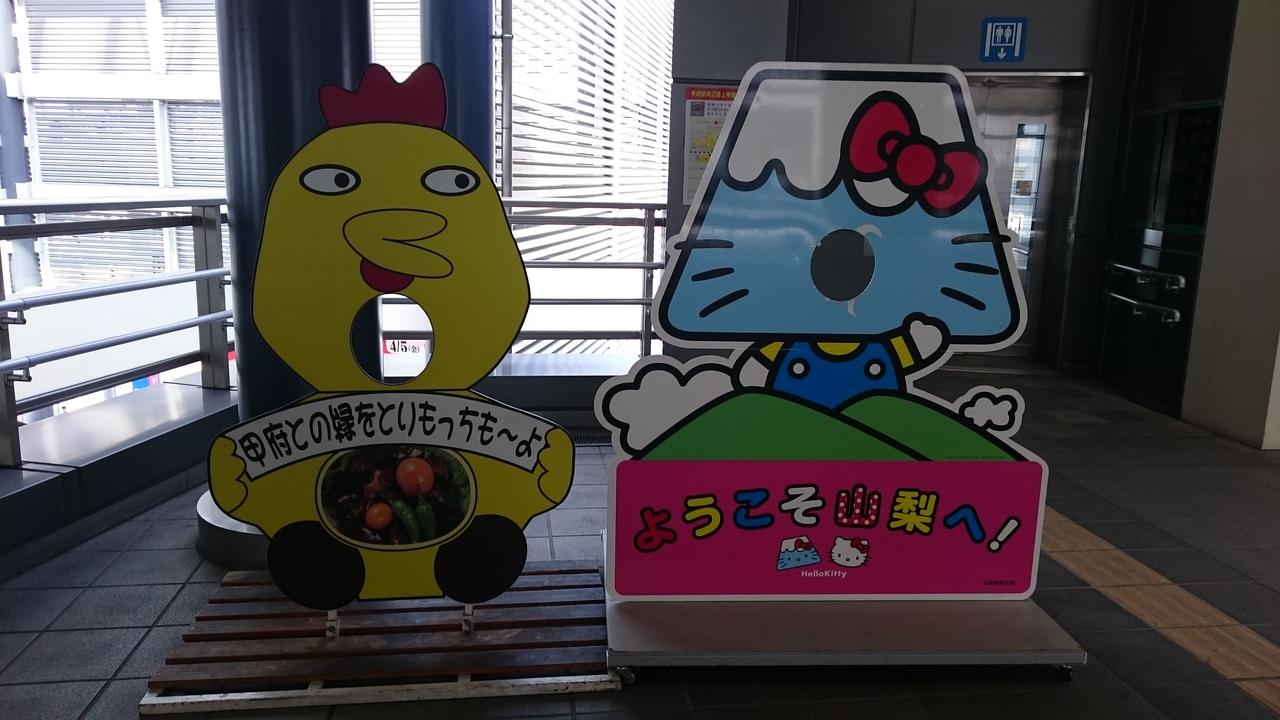 甲府駅にあった顔出しパネル。ご当地キャラのとりもっちゃんと、富士山キティちゃん。