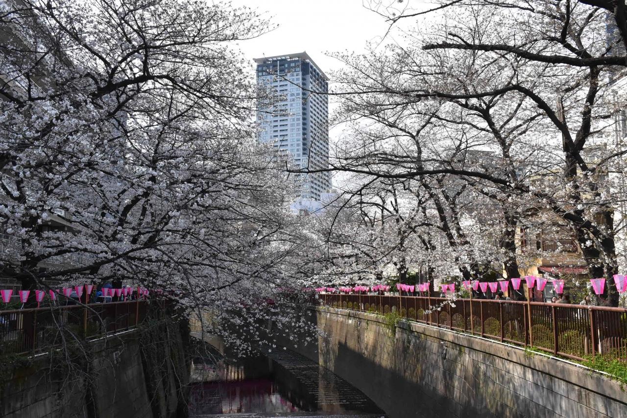 目黒川の上流・中流にあたる池尻大橋~中目黒間は川幅が狭く、桜の花が川を覆いつくします。