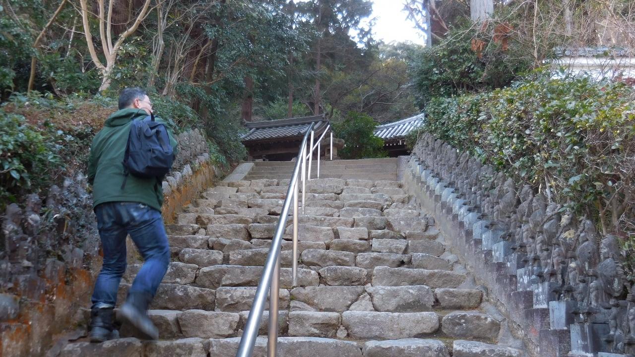 このコースの前半のハイライトは清滝石仏群と千光寺。渓流沿いの岩壁に彫られた素朴な摩崖仏群は緑に苔むしとても落ち着きます。千光寺は役行者が開祖と伝えられる静かな山中の古刹です。鳴川峠までの山道は緑の木々に覆われた渓流沿いの道を歩くのでとても涼しく、特に真夏にお勧めです。