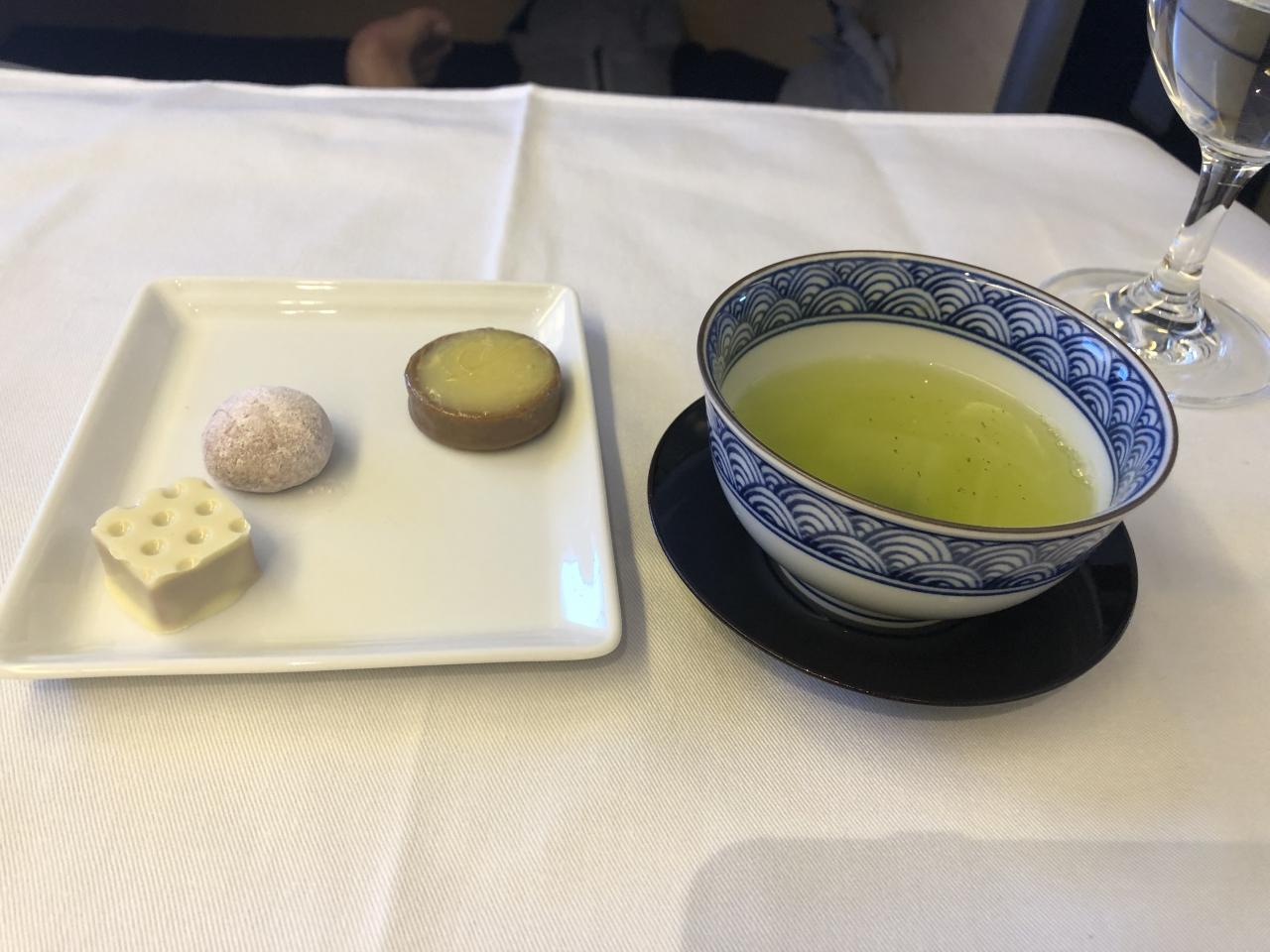 1時間弱のフライト、夕方の機内食です。愛媛道後の旅館「梅壇」の仕出し料理。デザートの餡入りタルトが美味しかったです。