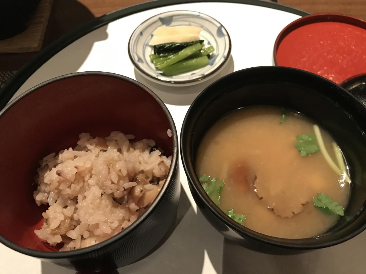 茸ご飯、味噌汁、香の物。 -